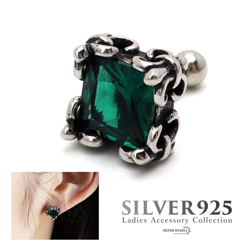 - エメラルドグリーンピアス 一粒ピアス ゆりの紋章 フレアスタッドピアス 個性的 シンプル かわいい シルバー925 片耳用