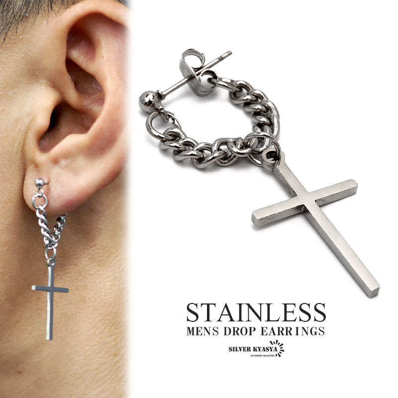 - ドロップピアス チェーン クロス 十字架 ステンレス フープピアス 喜平 スタッドピアス ボディピアス 片耳用 金属アレルギー