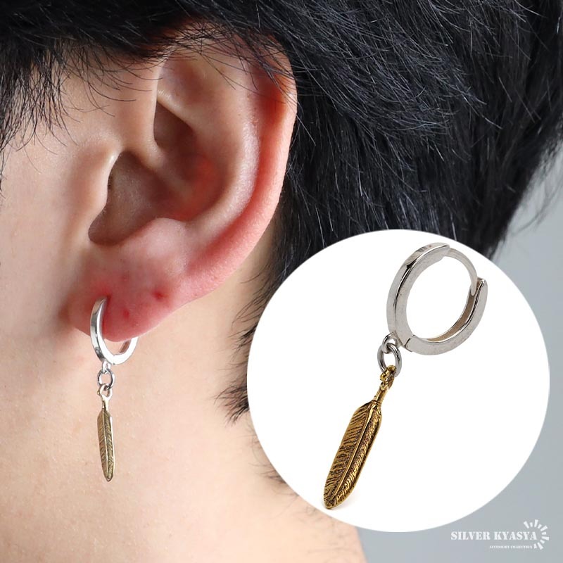 - 金のフェザーがアクセントフープピアス メンズ シルバー925 羽根 ピアス 片耳1点 金アレ対応