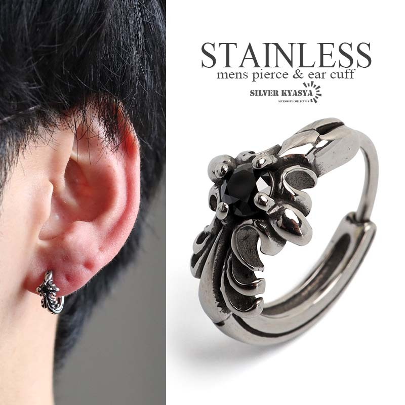 - ステンレス製 クロスピアス フープピアス シルバー フローラル 一粒ピアス 十字架 片耳1点 プチプラ メンズ 金アレ対応