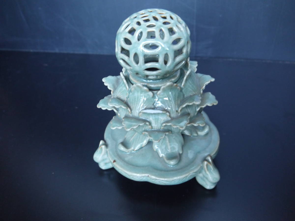 - ☆【A10714】中国古美術 貫入 青釉 三足香炉 青磁香炉 パイナップル?青磁器 時代古物 茶道具 珍品