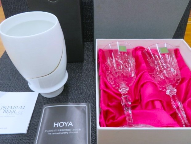 - [お31] HOYA CRYSTAL ホヤ クリスタル ワイングラス 2客 ペア & 有田焼 錦右衛門 プレミアムビアグラス 1客 箱付き 引き出物 景品