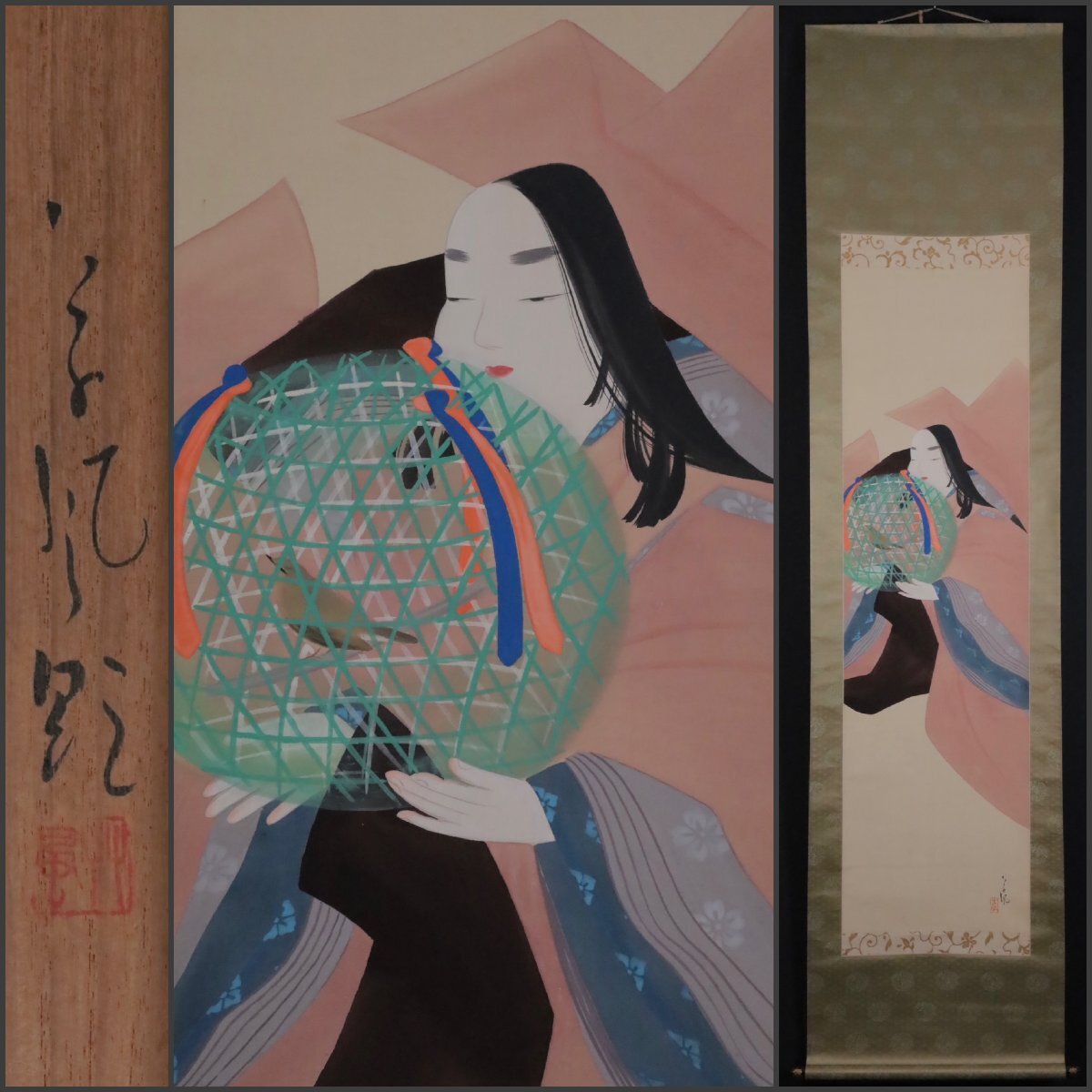 - 【模写】吉】11897 長野草風 源氏物語 初音図 共箱 大和絵 風俗画 物語絵 美人図 古典 茶掛け 茶道具 掛軸 掛け軸 骨董品