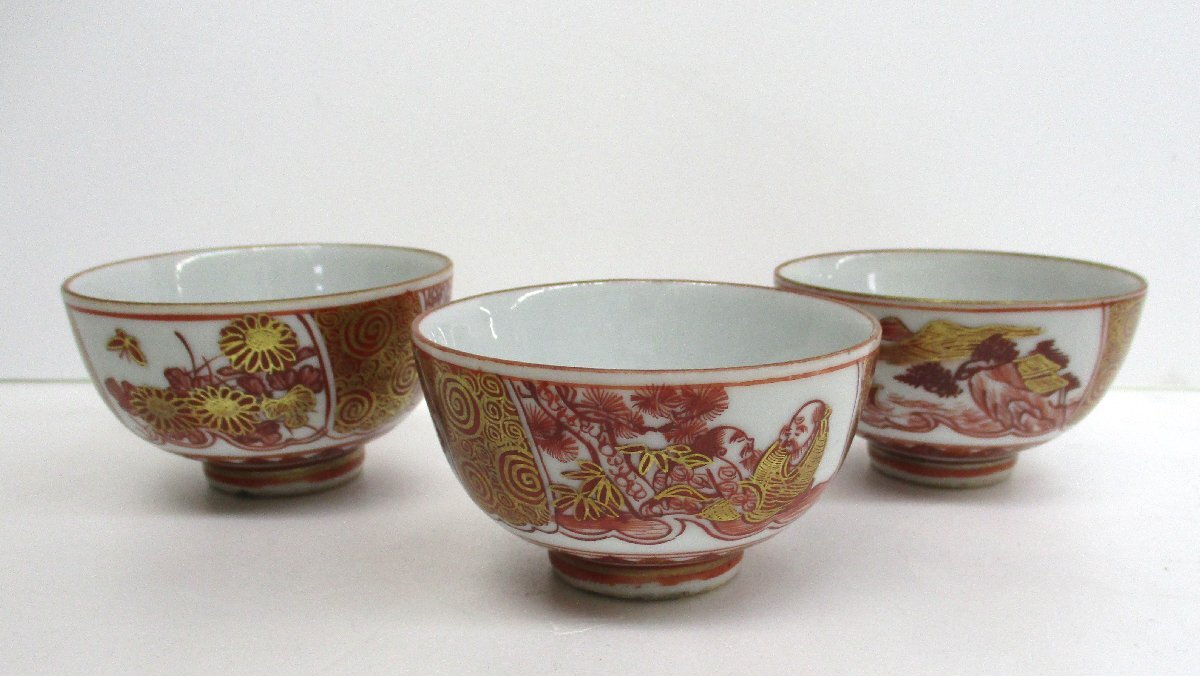 - ★ 99448 九谷焼 湯呑3個セット 古金 金彩 赤絵 菊老人模様 直径7.7cm 高さ4.4cm ★