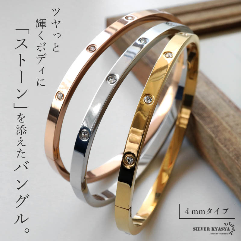 > (ローズゴールド) ステンレス メタルバングル ストーンバングル ピンク 腕輪 キラキラ レディース 女性 金アレ対応