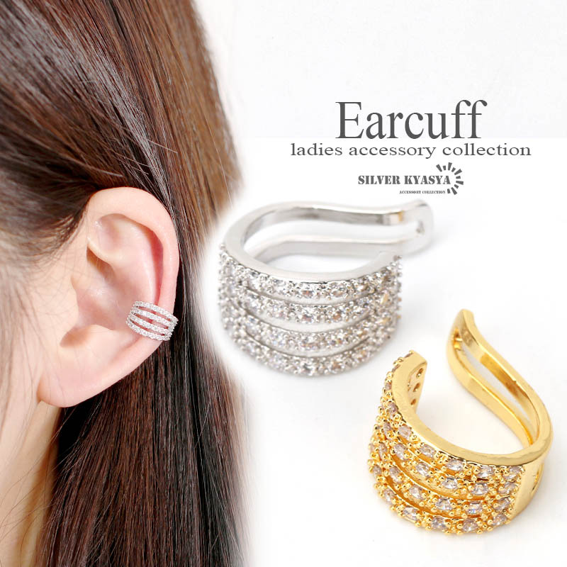 - (シルバー) 耳の穴不要 イヤーカフ CZ 4連 ノンホールピアス ゴールド シルバー フェイクピアス ワイド 片耳用1点