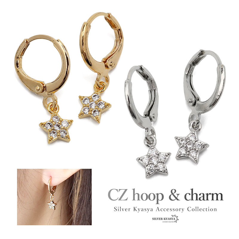 - (シルバー) チャーム ピアス CZランク ビジュー 18K GP チャームピアス 星 スター 小ぶり 両耳用 2点セット
