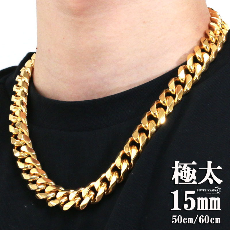> (50cm) 幅15mm ステンレス 喜平ネックレス 6面カット マイアミキューバン 喜平チェーンネックレス ゴールド 極太 太め