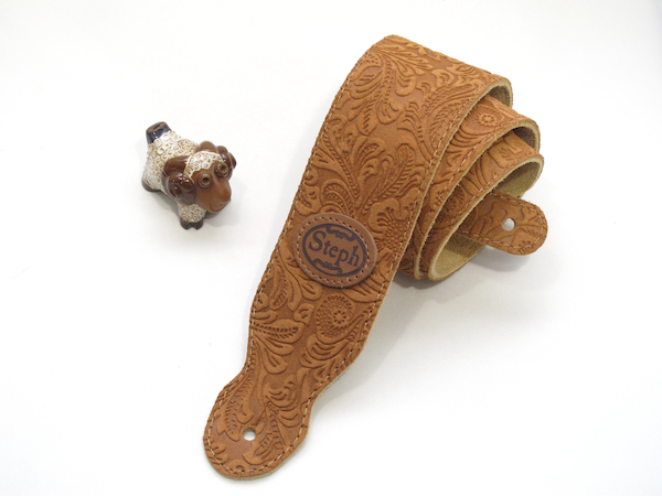 > [新品] Steph)レザーストラップ BS-1029 スエード/コニャック・ベージュステッチ エンボス加工 ギターストラップ Made in CANADA.