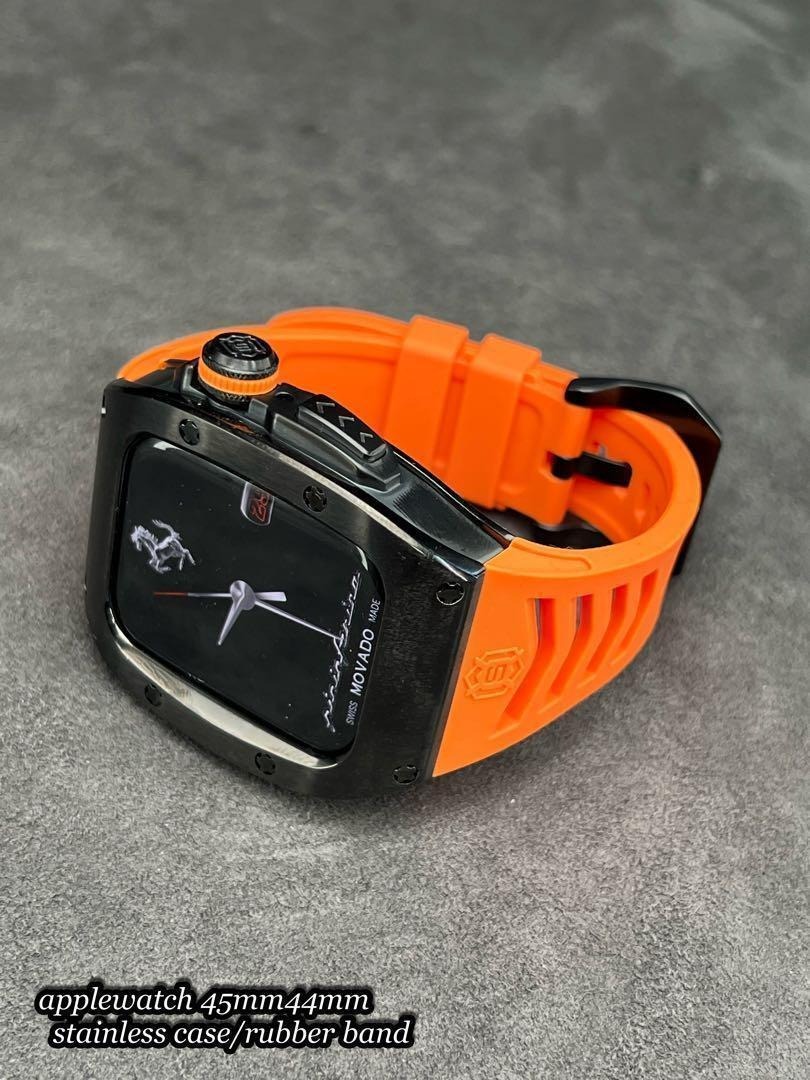 - アップルウォッチ 45mm 44mm ブラック フルステンレスケース オレンジ ベルト シリーズ456789 SE