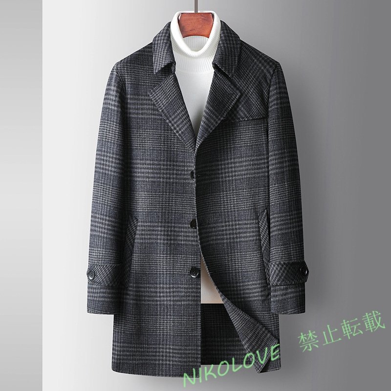 > ☆新品ウールコート チェック柄 メンズ コート カシミヤ 紳士服 ロングコート ビジネスコート アウター チェスターコート グレー① L LK500