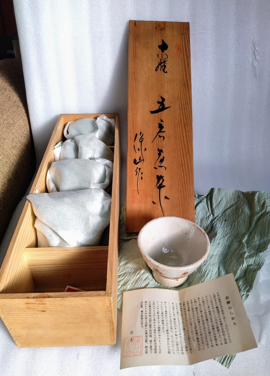 - K851 志野焼 ぐい呑み 湯呑 5客 共箱 栞 長期保管