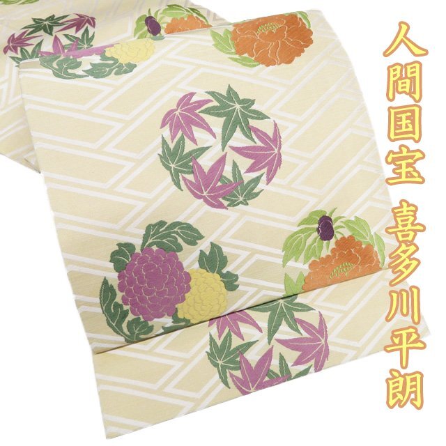 > 特選 袋帯 中古 リサイクル 正絹 カジュアル 仕立て上がり 人間国宝 喜多川平朗 桧垣文 花の図 金通し 鳥の子色 多色 きもの北條 A1146-11