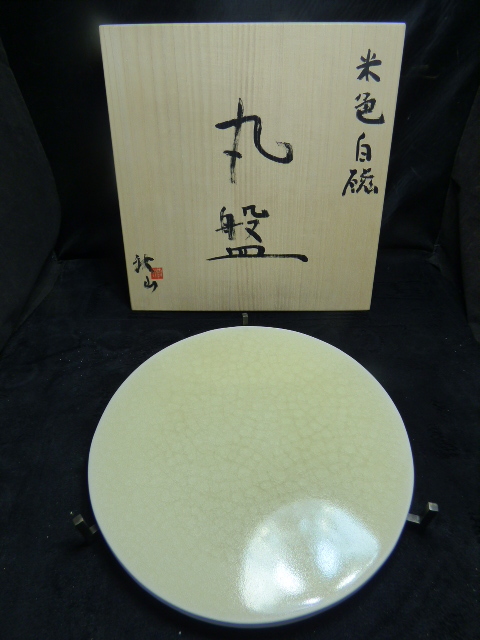 - ほ768.米色白磁 丸盤 北山 スタンド付き 共箱入り Φ35cm