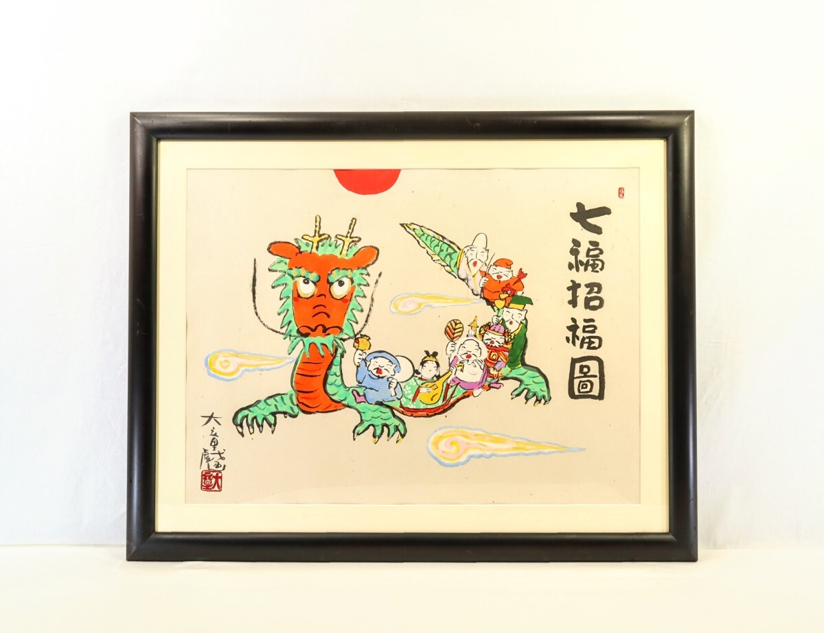 - 真作 山内大童 彩墨「七福招福図 (龍)」画寸 70.5×52cm 東京都出身 無所属 天空の昇龍と福の神 墨で輪郭をとり岩絵具で鮮やかに描く 10371