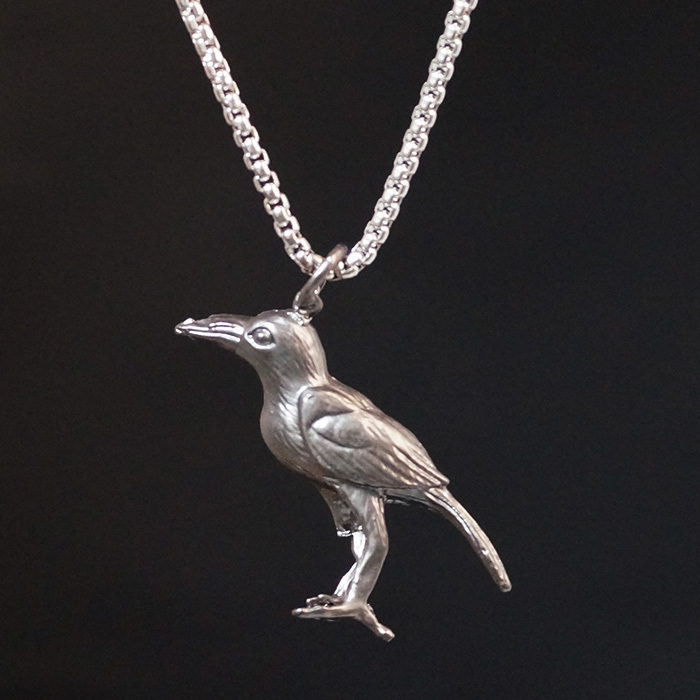 - [PENDANT NECKLACE] Black Silver Crow カラス 鳥 裏面 骨格 デザイン ブラック シルバー ペンダント ボックスチェーン ネックレス