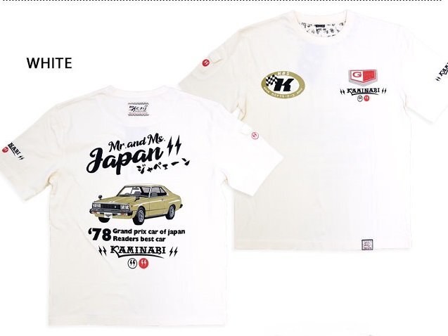 - ジャパン半袖Tシャツ◆カミナリ ホワイトLサイズ 大排気量 KMT-252 雷 エフ商会 5代目 スカイライン ニッサン 昭和 旧車