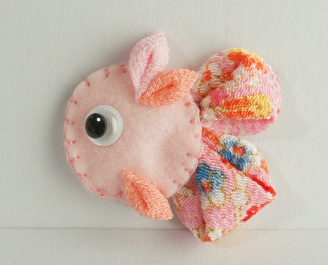 - ♪ ハンドメイド きんぎょ 金魚 ブローチ ちりめん つまみ細工 フェルト 動眼 綿入り