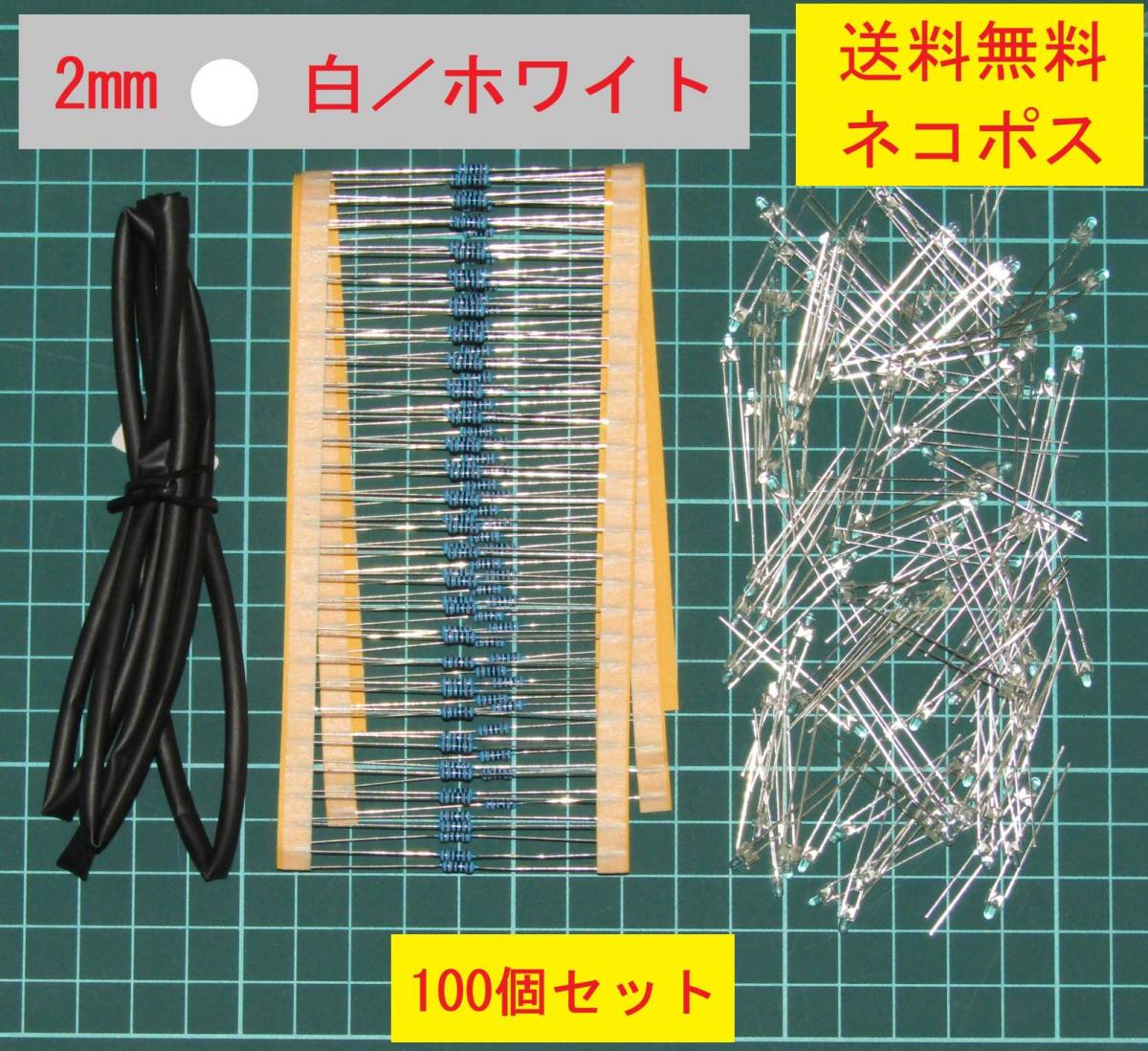 - 2Φ(2mm)LED 発色/ホワイト(白色) 抵抗、チューブ付属(12V仕様)/100セット ジオラマ/鉄道模型/プラモデル等の照明
