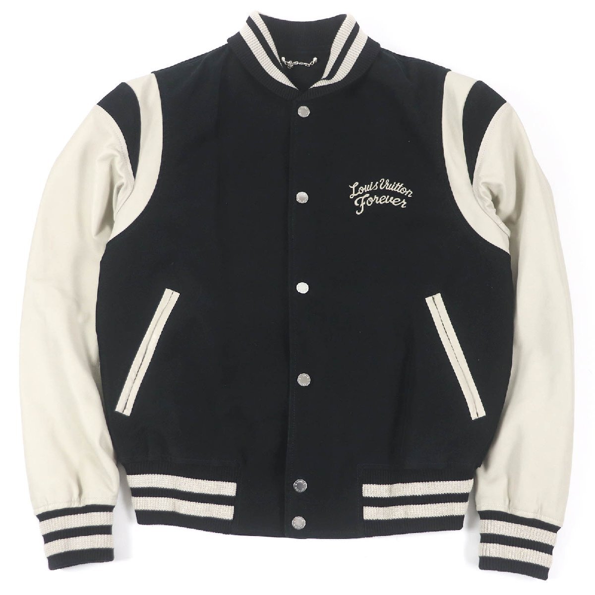 > 美品□LOUIS VUITTON ルイヴィトン 19SS ロゴ刺繍 袖ラムレザー バーシティジャケット スタジャン ブラック 46 イタリア製 正規品 メンズ