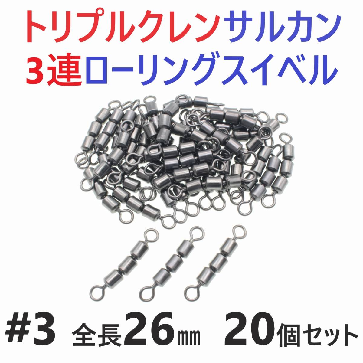 - 【送料無料】トリプルクレン サルカン 3連 ローリングスイベル #3 全長26㎜ 強度40㎏ 20個セット 強力ヨリモドシ 超回転で糸ヨリ解消!