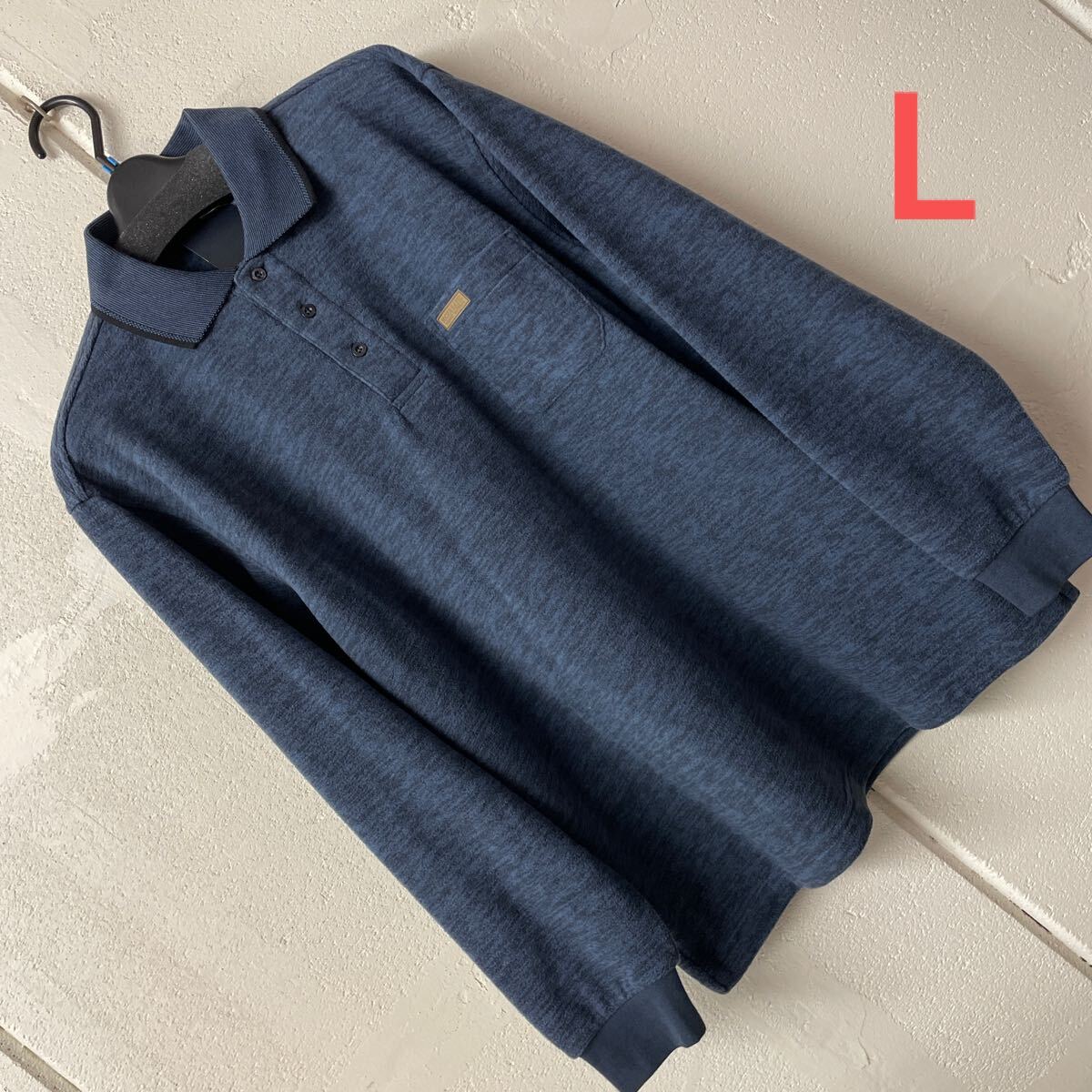 - Lサイズメンズ裏起毛胸ポケット長袖ポロシャツ 杢ネイビー