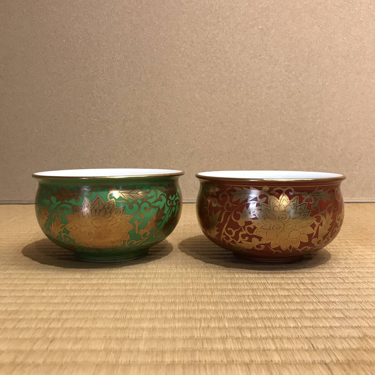 - 加藤利昇 建水 セット 金襴手牡丹唐草 赤地 萌黄