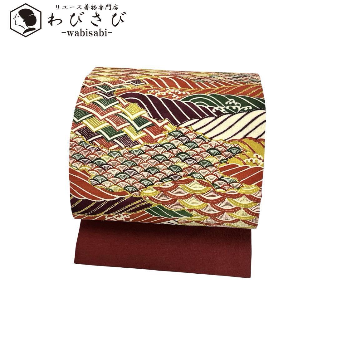> 名古屋帯 型染 青海波 多様な波模様 深緋色 縮緬 O-4718 着物 きもの kimono 和服 和装 中古 リサイクル着物 【送料無料】