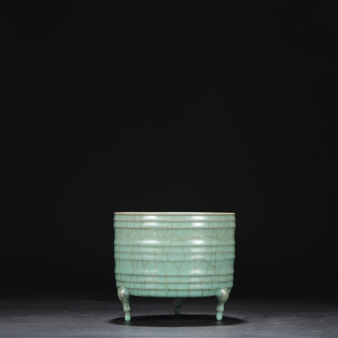 - 宋時代 官窯 青釉 弦文鼎式大洗 唐物 箱付き 陶磁器 中国美術 古美術 置物 高さ14cm 口径15.5cm RG257