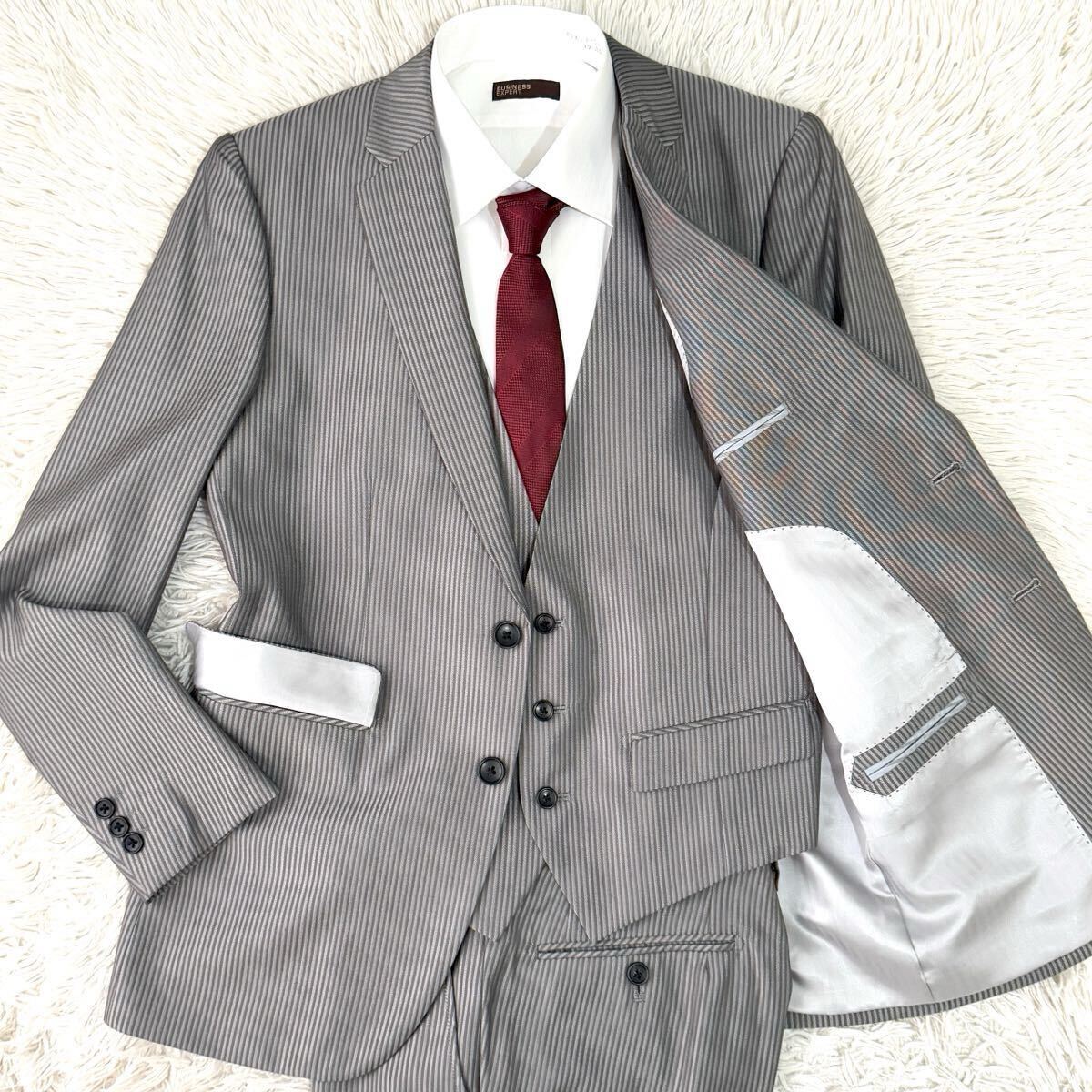 > 美品【極上のスリーピース】光沢 シルバー TETE HOMME 3ピース スーツ セットアップ ベスト ジレ Mサイズ相当 テットオム 艶感◎ 高級感◎