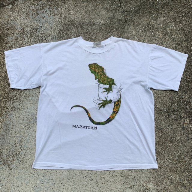 > 【XL】80s-90s メキシコ製 イグアナ プリントTシャツ 白■ビンテージ オールド アメリカ古着 シングルステッチ 綿ポリ 動物 爬虫類