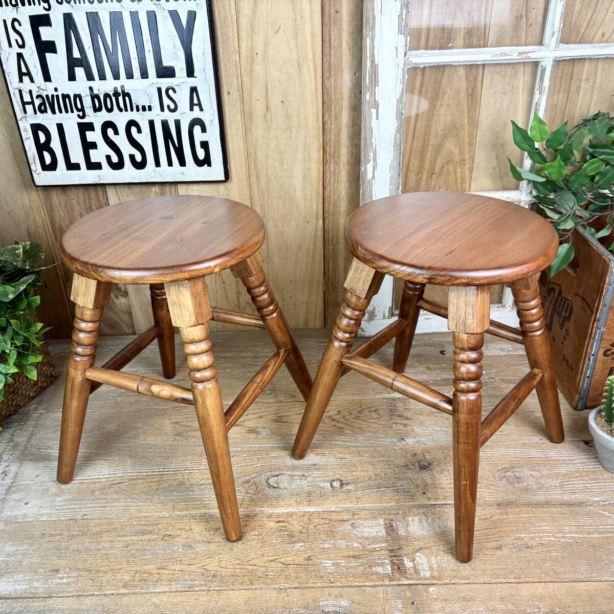 - 送料無料、北欧カントリー調木製パイン材丸スツール二脚セット、天然無垢、松材無垢材チェア、イス花台椅子置台、彫刻脚、丸椅子、松材