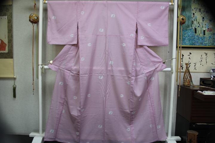 > きもの今昔8272 夏のきもの 合繊ポリエステル100% 絽の広衿単衣仕立て小紋 藤色小花飛び柄 身丈162cm