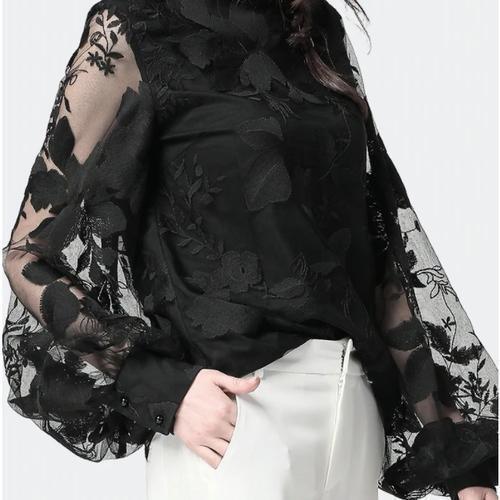 - L レディース ラウンドネック トレンドブラウス シースルーフローラル 花柄