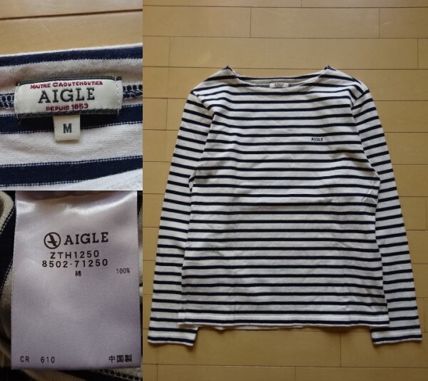 > 【AIGLE】長袖 ボーダーカットソー ホワイト/ネイビー SIZE:MEDIUM (エーグル,アウトドア)