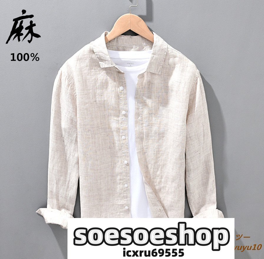 - 入手困難★リネンシャツ 新品 メンズシャツ 長袖シャツ 通気性 麻100% 涼しい 春夏デザイナーズ 紳士 カジュアル 無地 細身 ベージュ L
