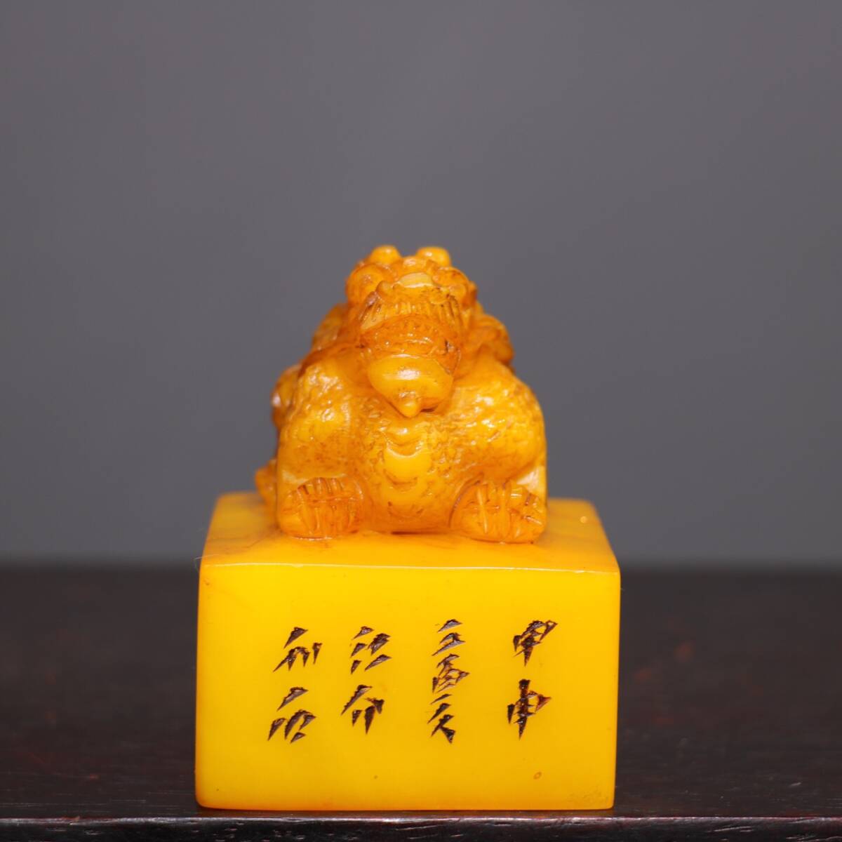- 『館蔵珍品 寿山石 田黄石 細密彫 古龍印章』置物 賞物 貴重物品 収蔵品 中国古美術