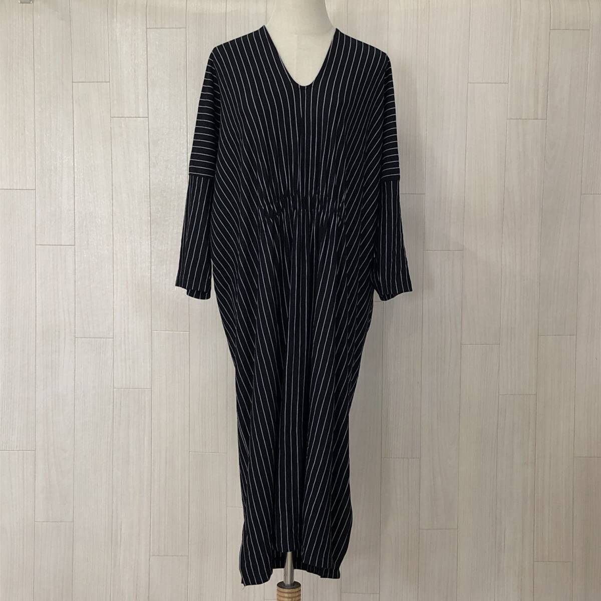 - Y1708 美品 BEGUM ビーガム レディース ワンピース 七分丈前面一部ウエストゴム LL ブラック 黒ホワイト白ストライプ春秋両脇スリットあり