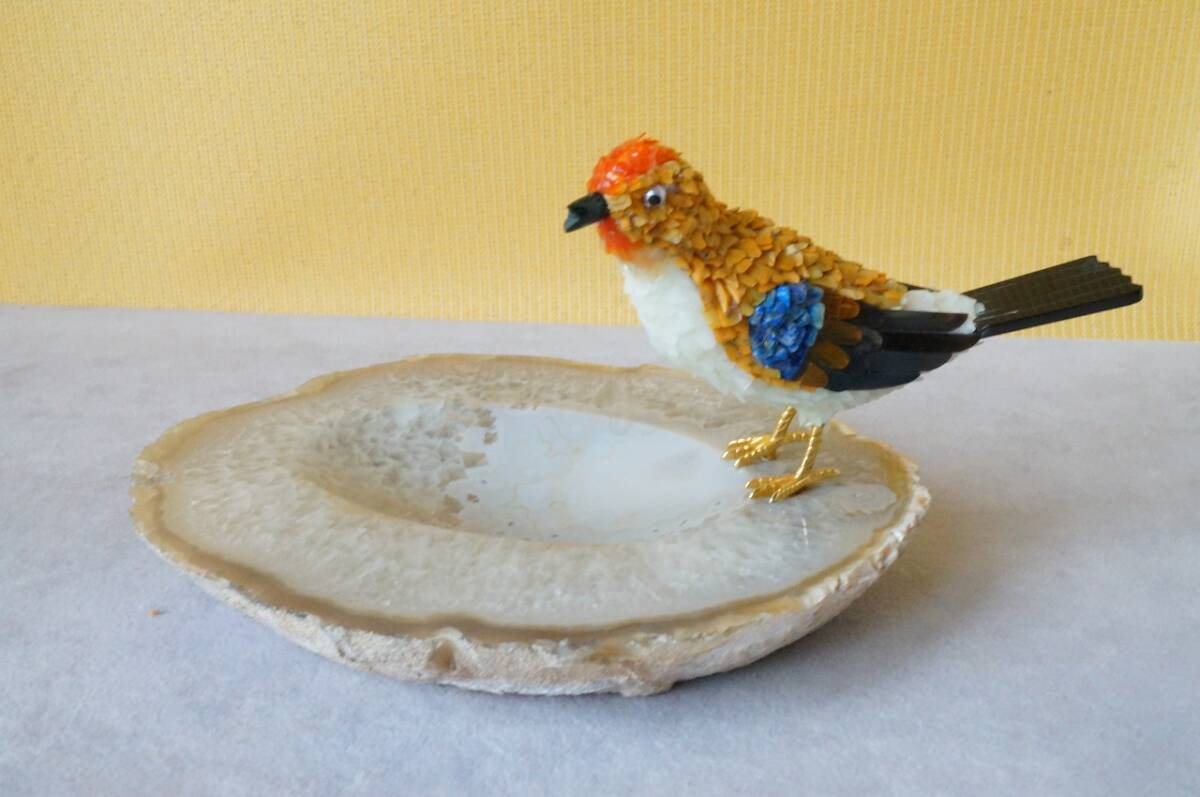 - 天然石の貴石鳥&メノウ原石小物入れ皿付飾り!貴石鳥ラピスラズリ、オニキス、メノウ、タイガーアイ、ケイ石使用!山梨加工品