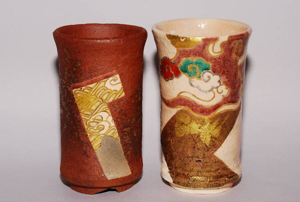 - 中村梅山 造 雀喜 ビールジョッキ 2客セット 色絵金彩 共箱 共布 酒器