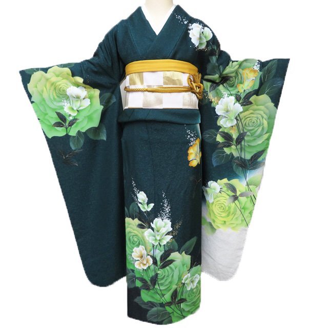 - 振袖 着物 中古 正絹 花模様 薔薇 バラ 銀通し 深緑色 多色 金銀 身丈180cm 裄72cm L トール きもの北條 A1156-10