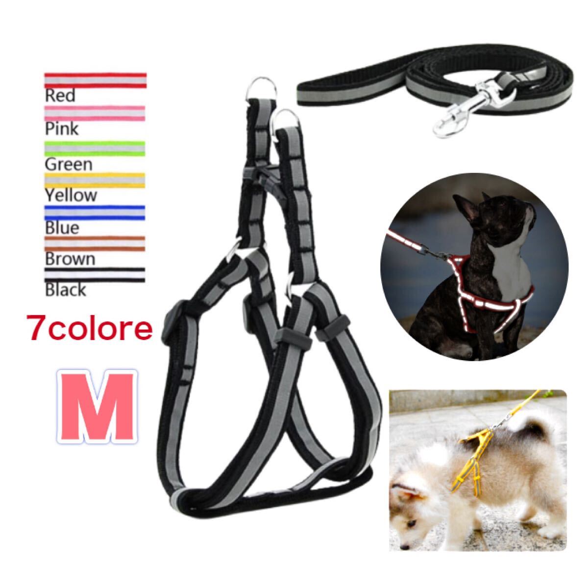 - 犬 Mサイズ ハーネス リードセット蛍光 反射 おしゃれ 夜 黒 ブラック 小型犬 反射板 犬用