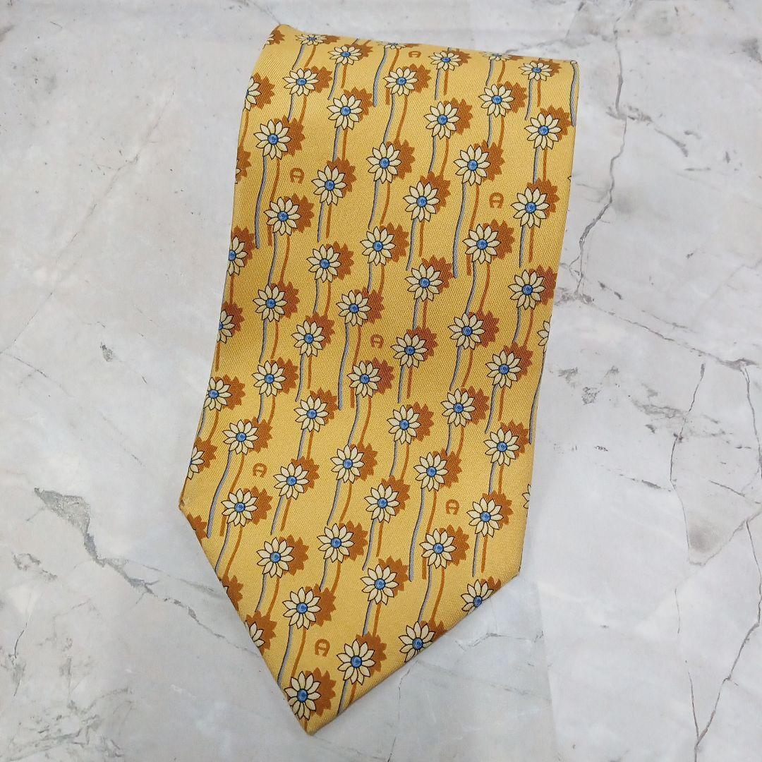 - アイグナー ネクタイ 黄 総柄 絹 シルク 明るい 花 【n616】