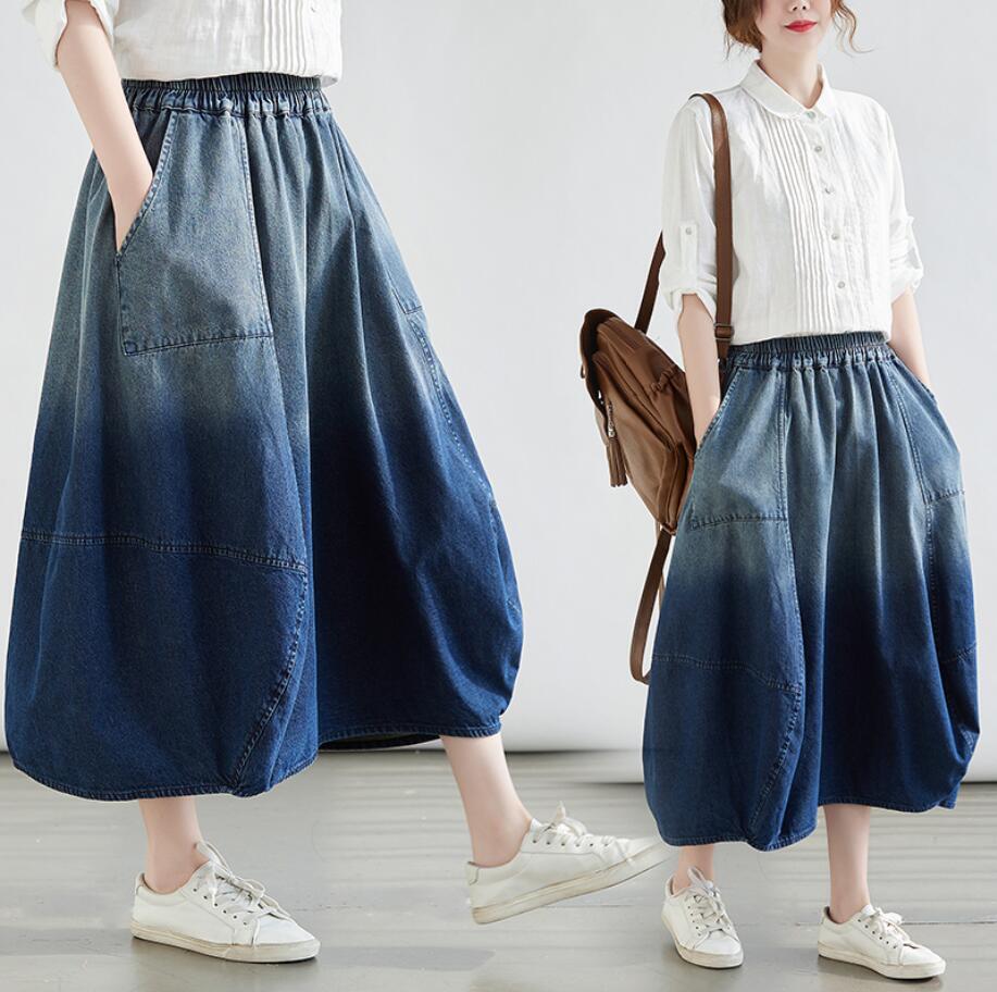- 人気推薦/レディース デニムスカート ウエストゴム ポケット 個性的 デニムロングスカート 体型カバー 無地 可愛い 着痩せ ロングスカート