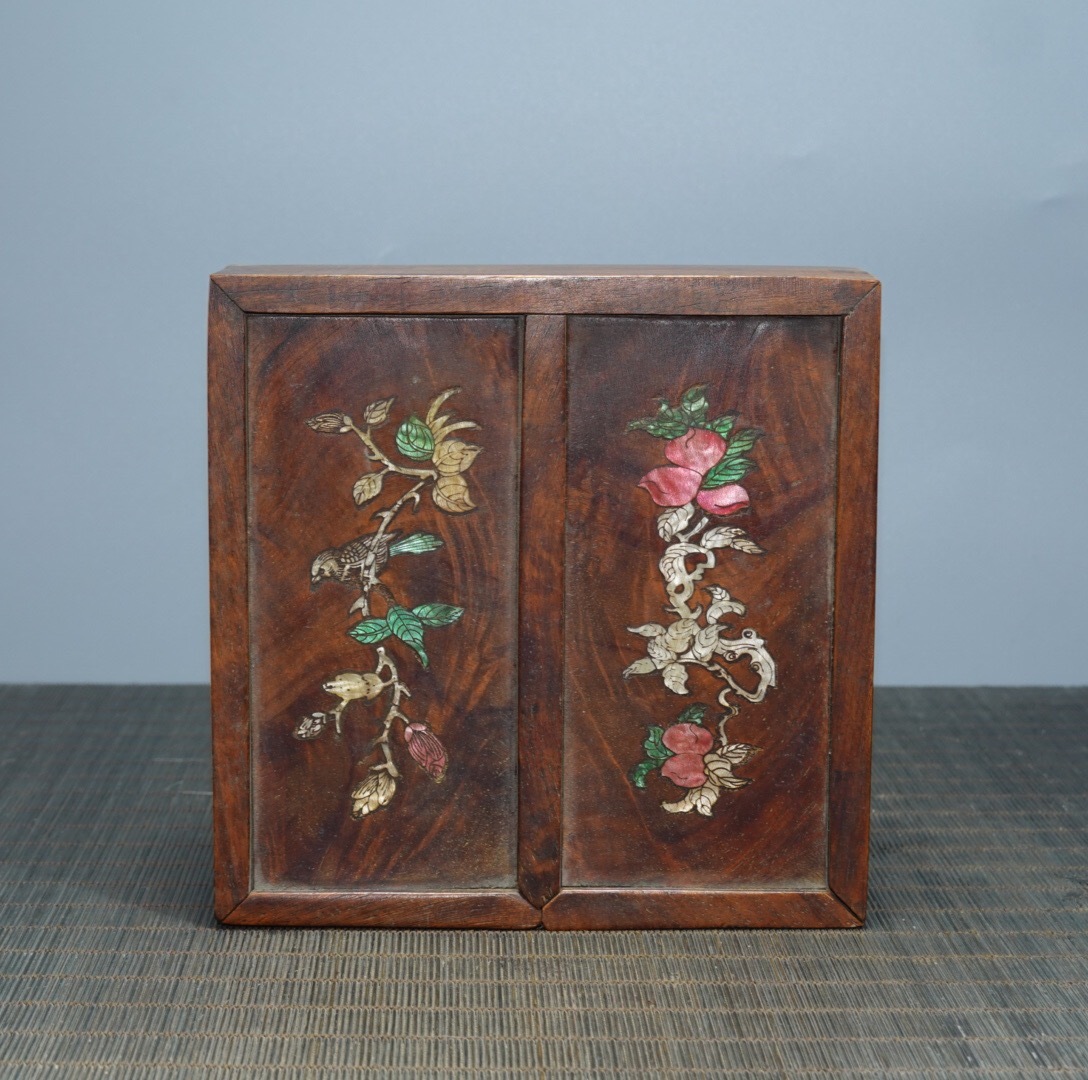 - ▽鴻▽ 花梨木製 細密彫 貝殼嵌 彩繪 花鳥紋 首飾盒 置物 古賞物 中国古玩 中国古美術