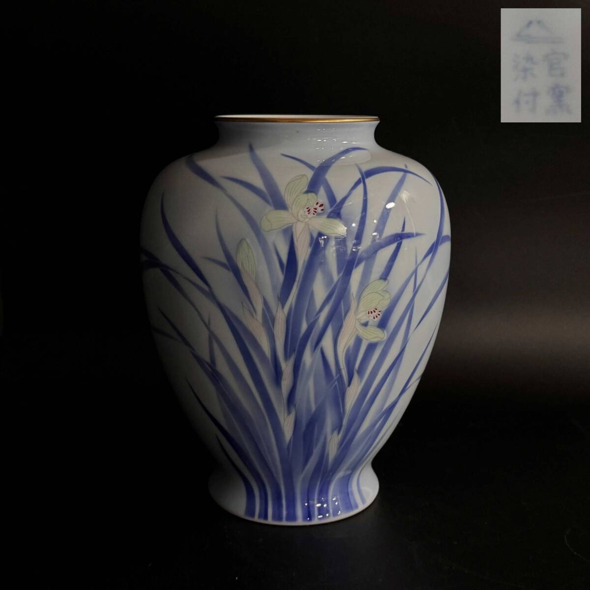 > 【62306Q】深川製磁 官窯染付 金彩 草花文 蘭 薄い青釉 花器 花瓶 花入 花生 華道具 茶道具 経年保管品 現状品