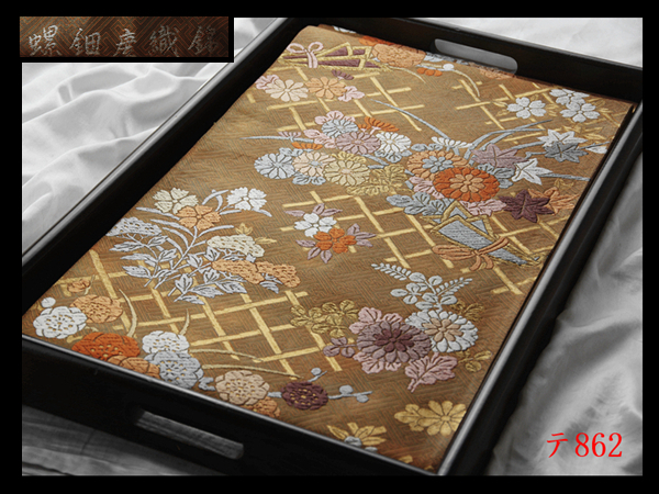 - 蔵【テ862】西陣逸品 螺鈿唐織錦 光悦垣菊紋 枇杷茶色地 気品豊かに 正絹純金糸六通高級美術袋帯◇検◇簪着物名古屋帯和装小物帯締め