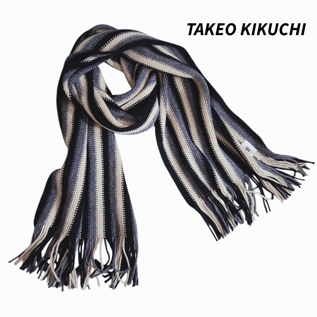 - TAKEO KIKUCHI ストライプ柄マフラー 黒・グレー・ライトベージュ 日本製 84257