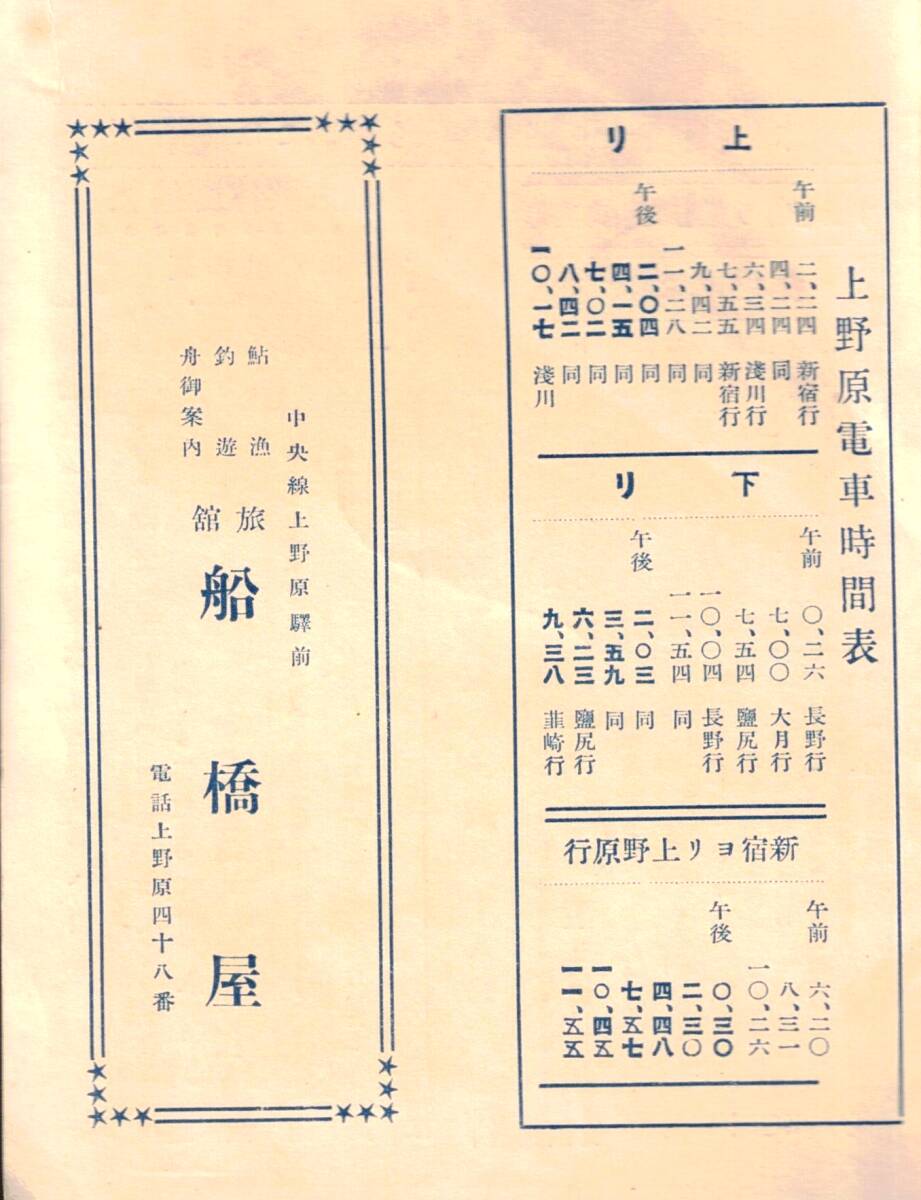 - 中央線上野原駅前鮎漁釣遊舟御案内旅館船橋屋 新宿より上野原駅往復一円八十八銭 上野原電車時間表・遊舟一隻十人乗船頭三人付八円等観光