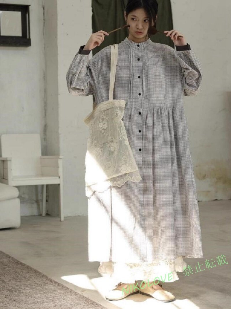 > ☆新品 春色!!ギンガムチェックのマキシ丈ワンピ★ ★大きいサイズ★ナチュラル系 紺色ボタン&紺色お袖口がかわいい MK491
